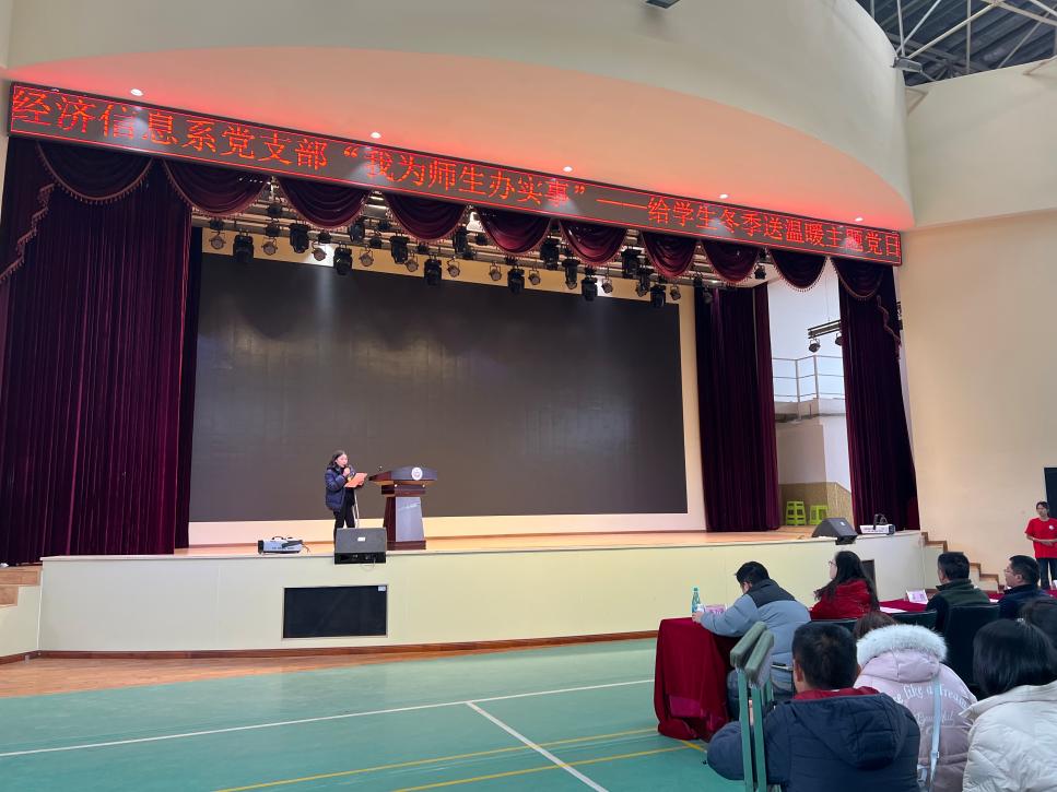 经济信息系党支部于12月24日中午13:00在学校礼堂开展“我为师生办实事”————给学生冬季送温暖主题党日活动。云南特殊职业教育学院党委副书记、院长董亮,党委副书记石红,副院长杨家晔,党委委员、宣传统战部部长张培新,经济信息系党政领导、全体党员、教师代表、入党积极分子和发展对象以及受助同学参加了此次活动。