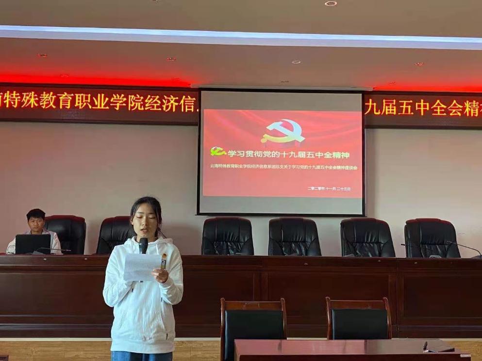 根据共青团中央印发《关于认真学习宣传贯彻党的十九届五中全会精神的通知》和《共青团云南特殊教育职业学院委员会关于组织团支部会议集中学习党的十九届五中全会精神的通知》的文件要求,对全团学习宣传贯彻全会精神做出部署,明确要求以团支部为主要方式组织开展学习。经济信息系团总支高度重视,将组织团支部开展学习作为一项重要政治任务,11月23日开始,开展“学习贯彻党的十九届五中全会精神”系列活动。参加此次座谈会的有经济信息系党支部副书记、系主任高翠同志,支部组织委员、团总支书记陶柯妤同志,6名团总支委员及各班团员代表。