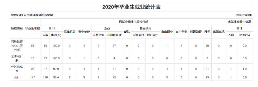 数字经济学院2020届毕业生98人,就业人数97人,就业率99%。其中6人考上党政机关、事业单位;2020届毕业生41人考上专升本,录取本科学校主要有:云南财经大学、西南林业大学、云南农业大学、昆明学院、保山学院、玉溪师范学院、文山学院、滇西科技师范学院、云南大学滇池学院、云南师范大学文理学院、云南经济管理学院、云南工商学院等。