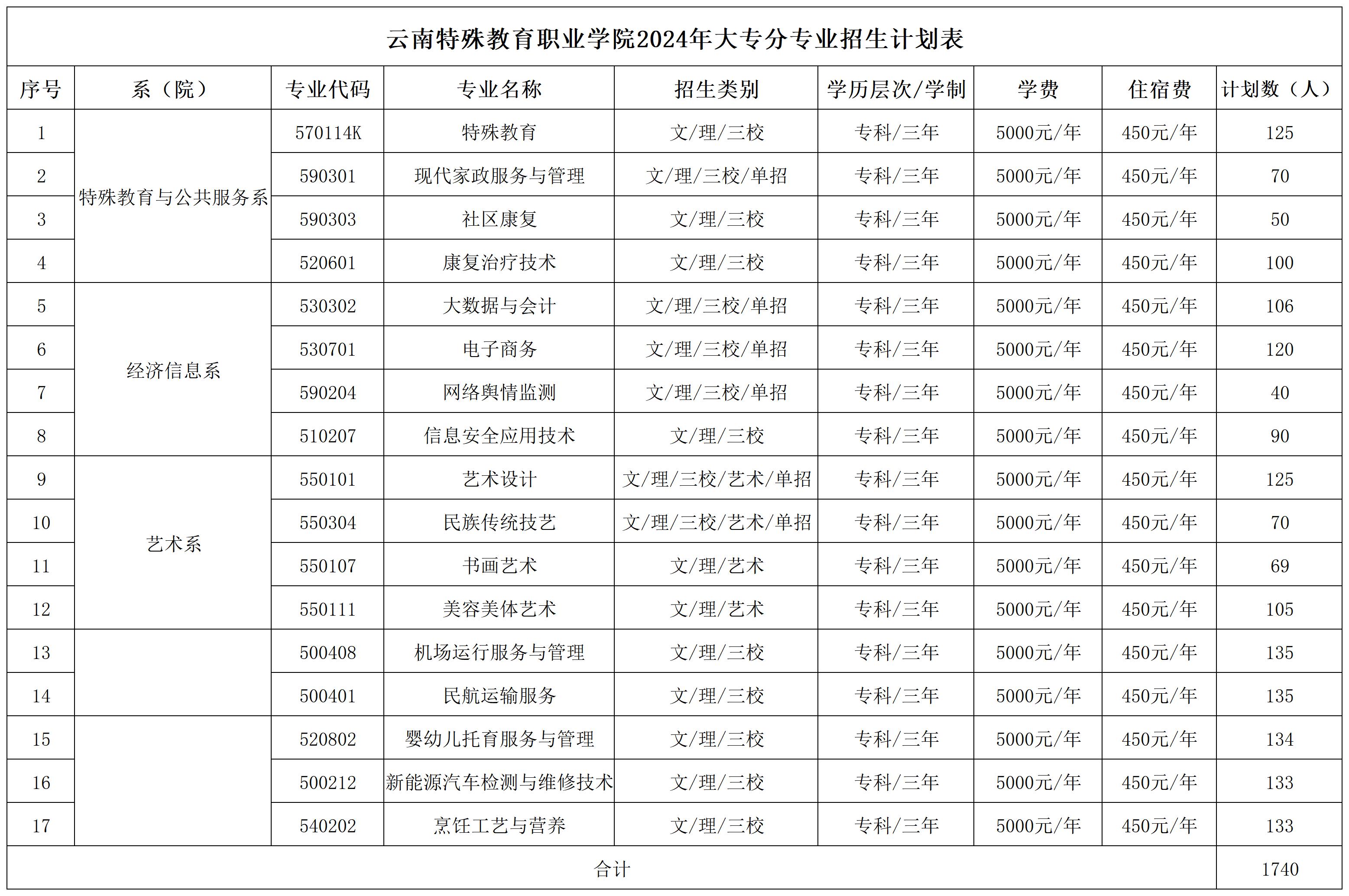 云南特殊教育职业学院2024年大专分专业招生计划表