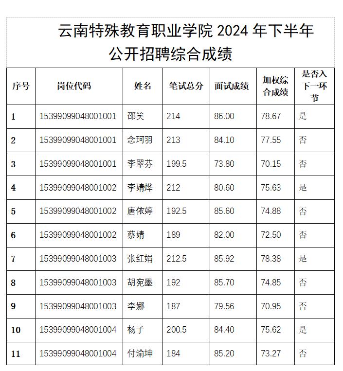 根据《云南省事业单位公开招聘工作人员办法》(云人社发〔2016〕182号)和《云南特殊教育职业学院2024年公开招聘工作人员公告》有关规定,经笔试、面试,现将综合成绩公示如下: