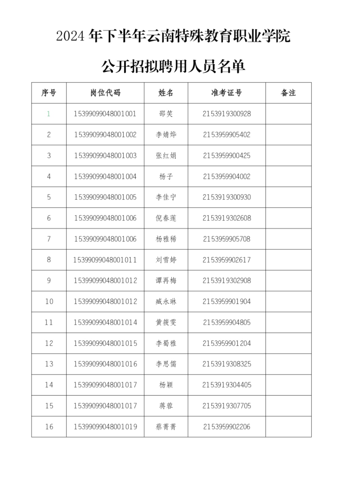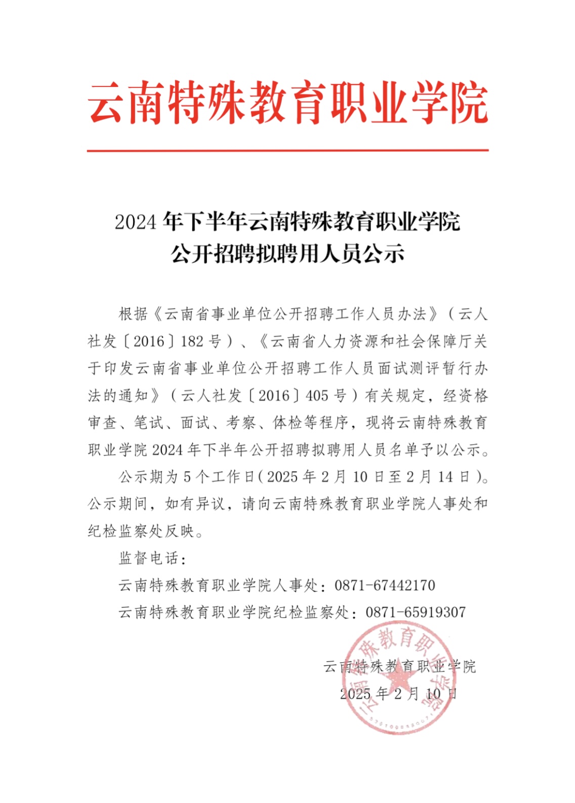 2024 年下半年云南特殊教育职业学院公开招拟聘用人员名单