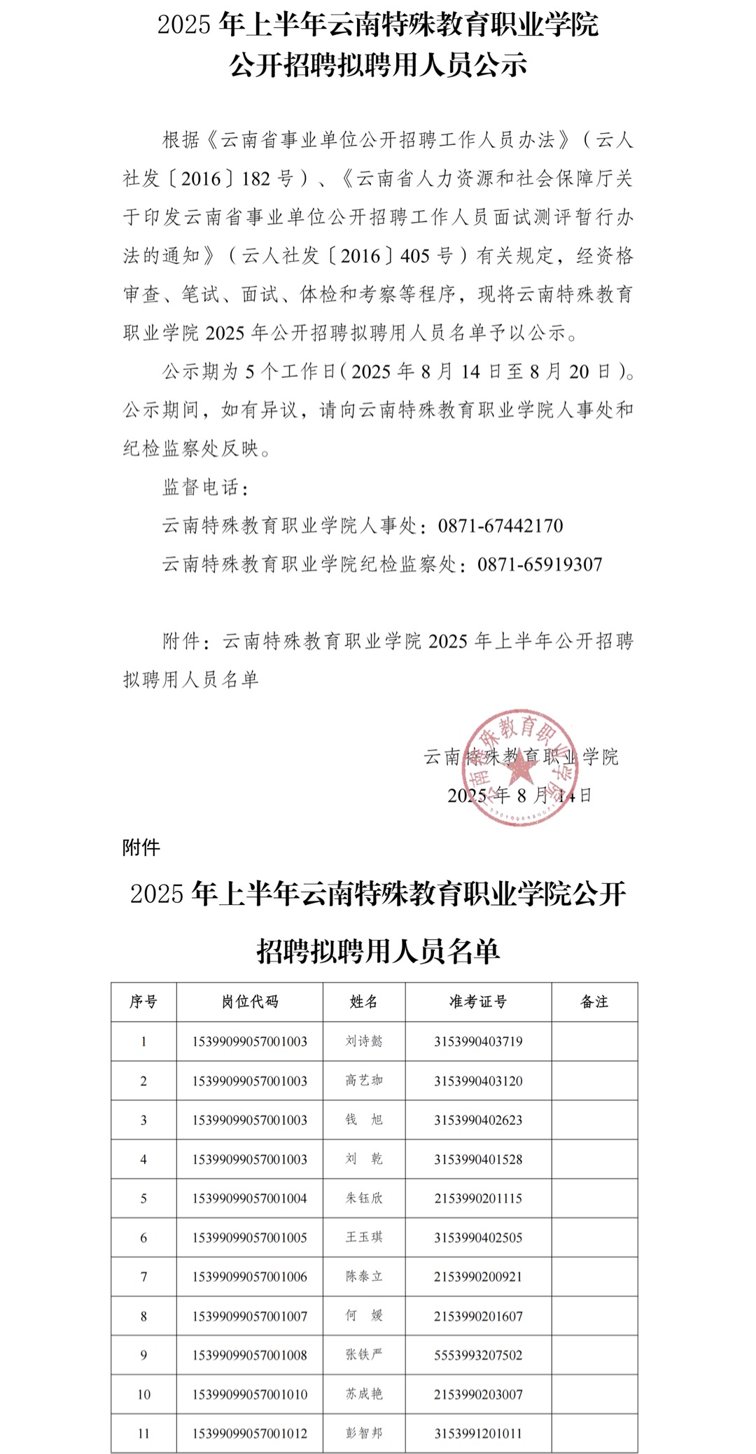 2025 年上半年云南特教育职业学院公开招聘拟聘用人员公示