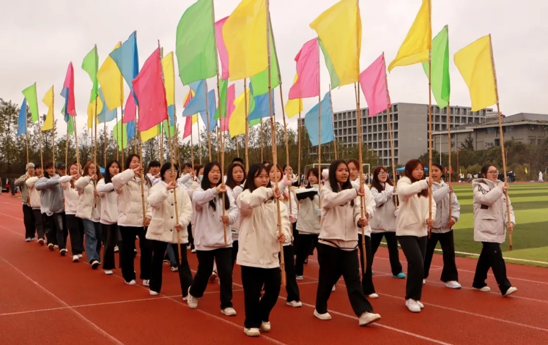 彩旗方阵精神抖擞地步入会场,手中挥舞的彩旗在阳光下熠熠生辉。整齐的步伐与飘扬的旗帜共同谱写青春的乐章,以最真挚的喜悦,为赛场注入蓬勃的生机与梦想的色彩。