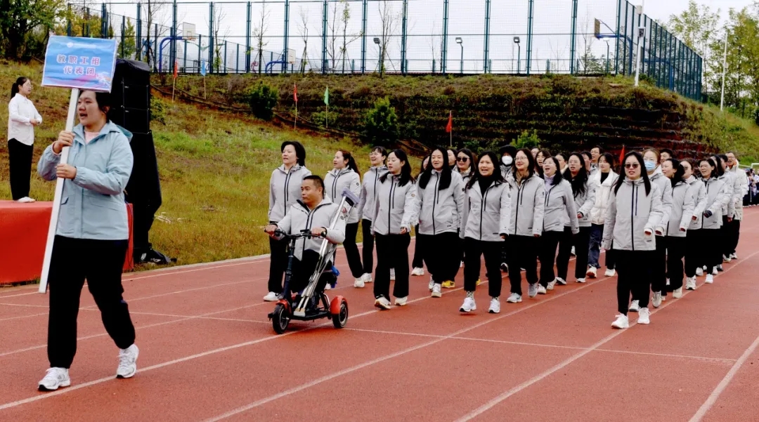 教职工方阵,统一的队服裹着育人热忱,轮椅上的身影也透着奋进力量。他们是讲台的耕耘者,更是赛场的追光人,用笑容与步伐,把温暖的奋进底色写在跑道上。