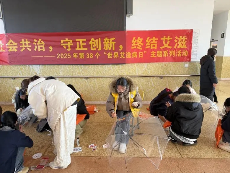 12月1日,校园活动现场化身“防艾知识乐园”。真人版“病毒打地鼠”游戏中,标有正确、错误选项答案的“地鼠”一经出现,师生迅速敲击正确选项,在趣味竞技中强化了风险防范认知;“撕名牌大战”中,参与者分组扮演“病毒”、“免疫细胞”,通过撕名牌互动,直观感受病毒传播与免疫防护的关系,师生在追逐互动中记忆核心信息,实现“玩中学、学中记”;“抱抱墙”前,师生主动拥抱扮演艾滋病病毒携带者的真人玩偶,用肢体语言传递“消除歧视、关爱平等”的理念,并在防艾宣言展板墙上写下防艾宣言;“防艾知识大冒险”设置多轮闯关问答,从传播途径辨析到检测治疗常识,层层深入的题目让师生在挑战中夯实防艾知识储备;手工制作区域,大家亲手剪裁红丝带、绘制防艾主题雨伞、手工漆画等,将科学认知与创意表达相结合,制作完成的作品串联成象征希望与守护的宣传长廊。 12月3日,我校组织师生志愿者和特邀专家走进社区,将防艾关爱延伸至社会一线。志愿者在社区广场设宣传展台,发放防艾宣传单页,在讲解艾滋病传播途径、防护要点和“四免一关怀”政策的同时,也告诉大家防艾中常见的认知误区。 我校2025年世界艾滋病日主题宣传系列活动,普及了防艾核心知识,更营造了“人人学防艾、人人懂防艾、人人守健康”的校园氛围。