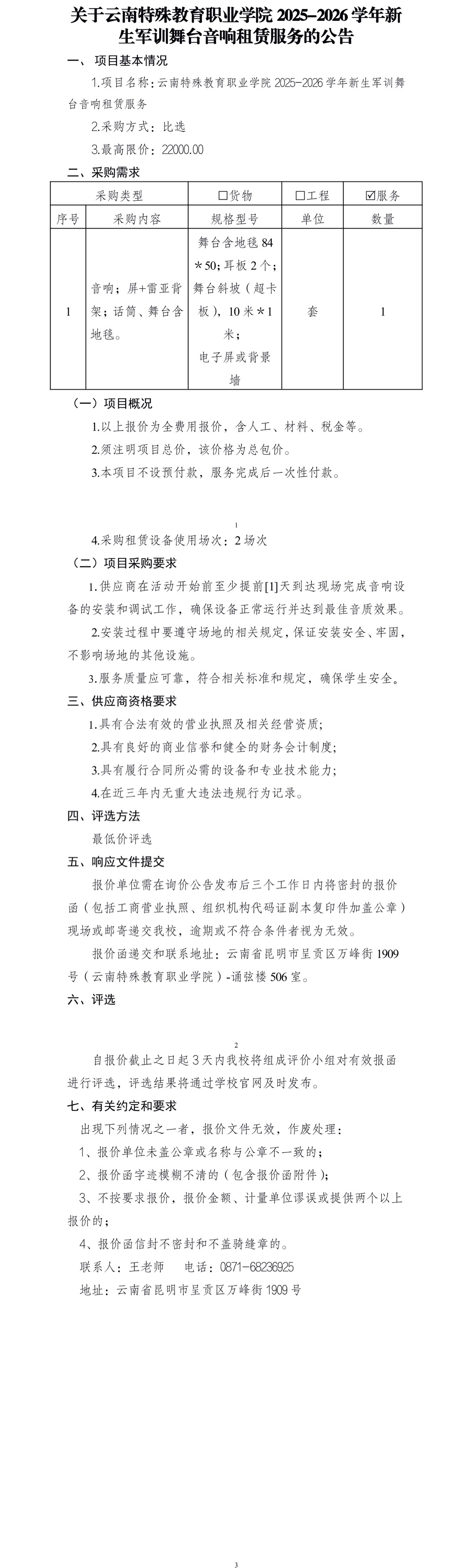 关于云南特殊教育职业学院2025-2026学年新生军训舞台音响租赁服务的公告